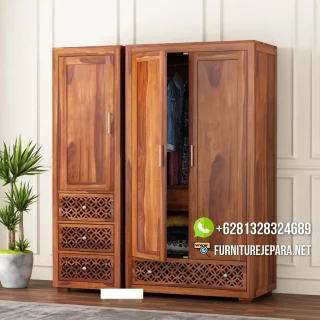 Model Lemari Pakaian Jati Jepara ini memeiliki tampilan yang sangat menarik dan elegan dengan menggunakan aplikasi finishing natural yang cantik, almari pakaian ini dibuat oleh pengrajin Mebel Jepara yang sudah sangat berpengalaman dibidang pembuatan produk furniture berkualitas tinggi serta dibuat dari bahan baku kayu dengan tingkat kekeringan dan umur kayu yang layak, kuat, kokoh, awet dan tidak mudah goyang, lemari pakaian mewah ini 4 pintu yang nyaman untuk digunakan diruang kamar tidur rumah idaman anda.